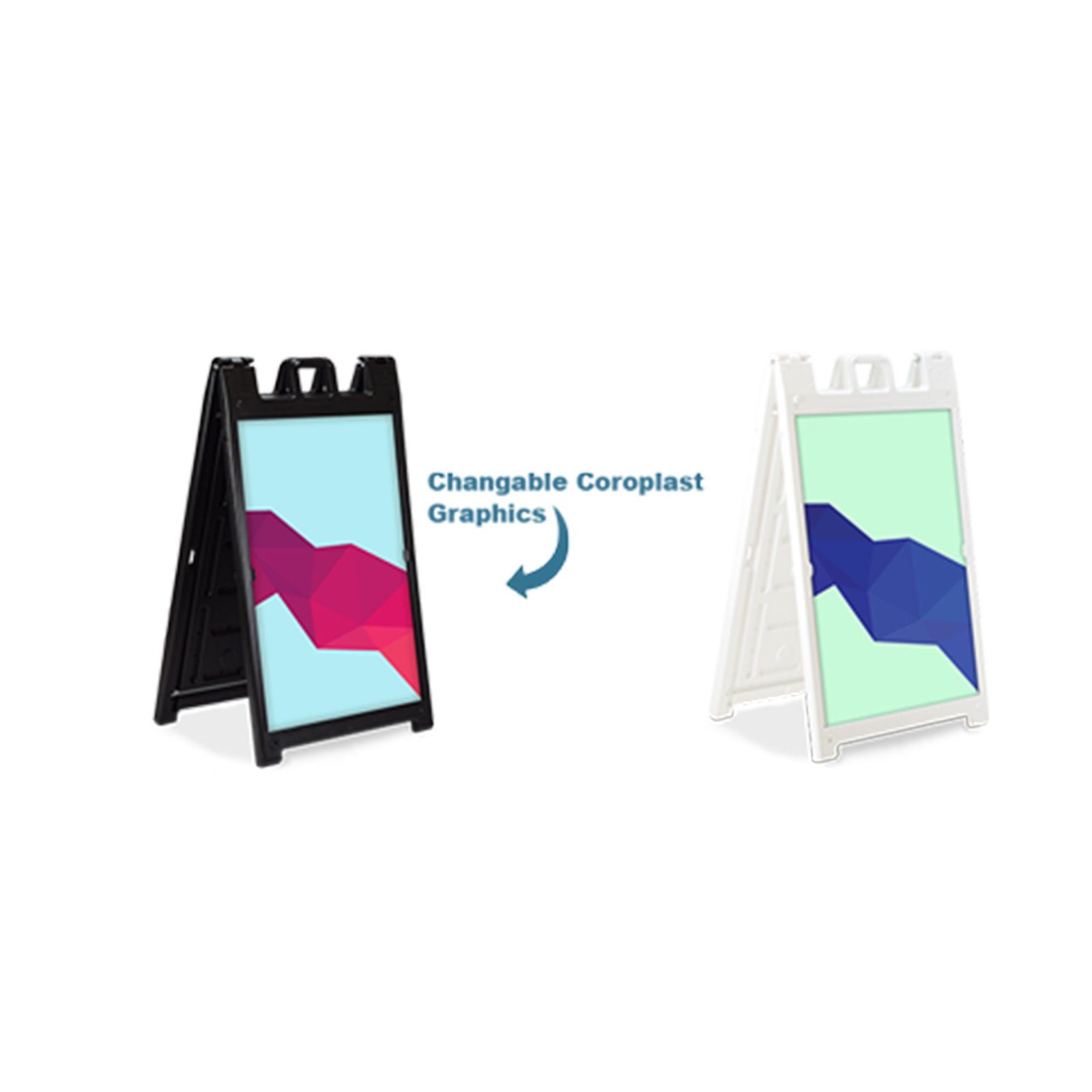 The Signicade Deluxe is the ultimate sidewalk advertising solution for those that need quick change graphics. The heavy-duty plastic sandwich board has two recessed 24×36 inch recessed graphic areas on the front and back. Coroplast mounted vinyl graphics slide easily into place for full-color signage, swap out these rigid signboard inserts as often as you need. Our graphics are full-color UV Direct Printed Coroplast for a long-lasting durable matte print.