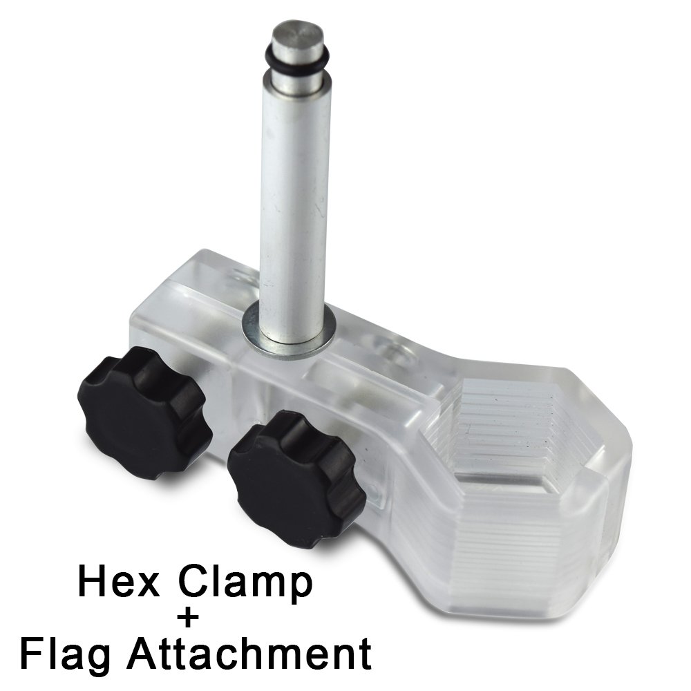 Flag holder hardware allows you to secure your flag to the leg of our premium aluminum hex frame. Package includes metal flag adapter that fits into the base of your flag pole and two Hex Clamps (1 Straight and 1 Offset) for use on any of the four tent legs.
