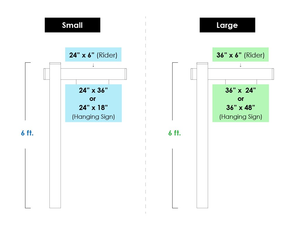 We offer Double Sided Aluminum Sandwich Board prints for long lasting outdoor graphics. Sizes available include: 24″ x 18″, 24″ x 36″ for the Small Post, 36″ x 24″ and 36″ x 48″ for the Large Post. Rider Signs are also available in 24″ x 6″ and 36” x 6”. Signs are pre-drilled for hanging from the Post Arm.